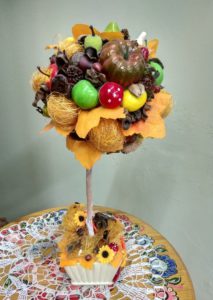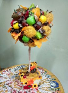 Потихонина Ольга Валерьевна, обучающаяся ГБПОУ РО «Волгодонский педагогический колледж» по специальности 44.02.03 Педагогика дополнительного образования в области изобразительной деятельности и ДПИ. Куратор Владимирова Фаина Юрьевна. Декоративная работа в технике «топиарий»: дерево, шишки, желуди, фетр, нитки, пластик, искусственные цветы и плоды, ткань, пенопласт.