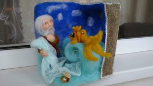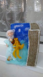 2 место — Боднева Светлана Михайловна, обучающаяся ГБПОУ РО «Волгодонский техникум общественного питания и торговли». «Старик и море», работа выполнена в технике сухого фелтинга: фотоизображения, бечевка, картон, электрический клей — карандаш, тесьма, тонкие иглы для вязания, пряжа оранжевого цвета, непряденная шерсть разных цветов, иглы для валяния, простой карандаш, иголка и толстая нитка, ножницы, бинт, стразы, ракушка.