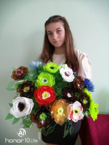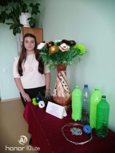 Кайданович Валентина Сергеевна, обучающаяся группы №32 по профессии Повар, кондитер. Куратор Кикилашвили Татьяна Васильевна. Композиция «Цветочный водопад», изготовлена из пластиковых бутылок разных цветов, алюминиевой и медной проволоки, изоленты и шурупов.