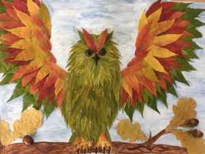 Борисенко Адександр Андреевич, обучающийся ГБПОУ РО «Волгодонское строительное профессиональное училище № 69» по профессии 23.01.08 Слесарь по ремонту строительных машин. Куратор Волочаев Александр Валентинович. «Тайны леса», использованные материалы: лист А1, клей, кисти, листья, краски, пластмассовые детали.