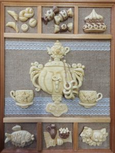 3 место — Сопрун Елизавета Юрьевна, обучающаяся ГБПОУ РО «Сальский индустриальный техникум». Куратор Садовая Светлана Аркадьевна. Панно «Русские народные традиции» состоит из 7 частей: самовар, две чашки, хлебобулочные изделия, рыбки, пирог, конфеты, запеченный поросенок и обед. Используемые материалы: солёное тесто, прошва, мешковина, рамка.